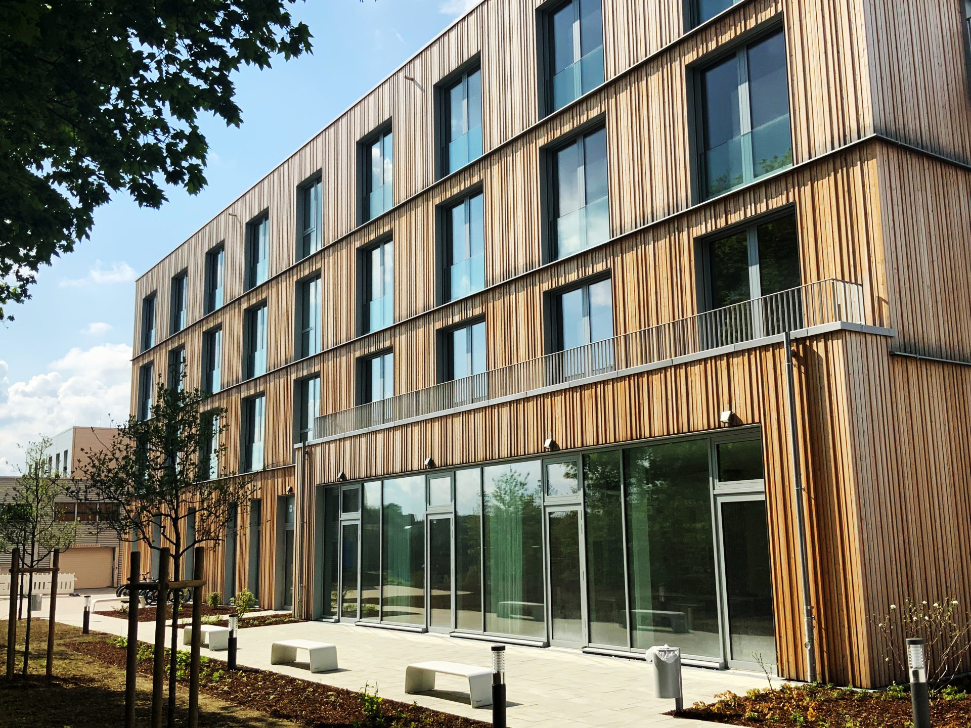 Viergeschossiges Gebäude für bis zu 776 Personen in Hybridbauweise.