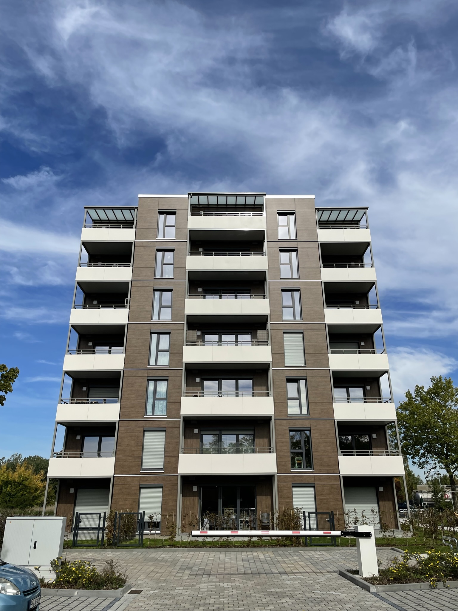 Siebengeschossiges Gebäude in mineralischer Massivbauweise; Außenwände der Obergeschosse in Holzbauweise.
