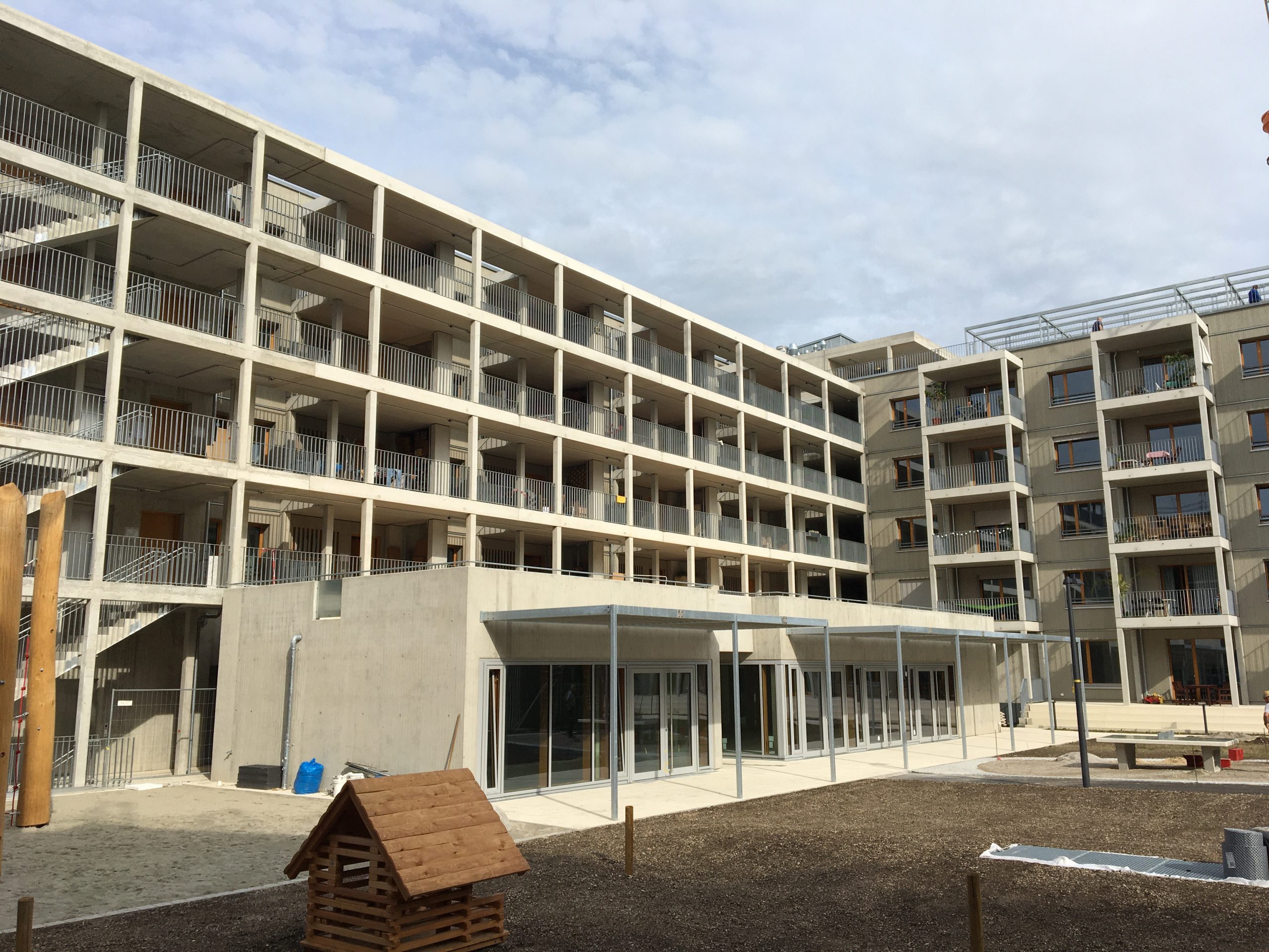 L-Bau mit 97 Wohn- und 5 Gewerbeeinheiten mit vertikaler, formschlüssiger Holzfassade; Planung anhand von Brandversuchen des Abschlussberichts des Lehrstuhls für Holzbau und Baukonstruktion der TU München für Gebäuden der GK 4 in Holzbauweise; Ausdehnung über 89 m x 15 m und 59 m x 13 m. Erreichbarkeit der Nutzungseinheiten über 3 offene Treppenaufgänge sowie notwendiger Flure als Laubengänge entlang der Gebäudelängsseiten. Ausführung von Öffnungen zwischen Wohneinheiten und notwendigem Flur in einer Höhe > 1,80 m mit reduzierter brandschutztechnischer Anforderung sowie fest verglaster Öffnungen im Bereich des durchlüfteten notwendigen Treppenraums; abweichende Türqualitäten für Öffnungen zwischen notwendigem Flur und notwendigem Treppenraum im Außenbereich. Tragende und aussteifende Bauteile sowie Brandwände teilweise als Massivholzwände nach bauaufsichtlichem Verwendbarkeitsnachweis abweichend zu HFHHolzR sowie einseitiger nicht brennbarer oberer Abschluss im Bereich des Daches. Großflächige PV- Anlage; Leitungsführung über Brandwand hinweg; 5 Brandabschnitte; Dach als F60-B Konstruktion. Sichtbare Holzdecken innerhalb der Nutzungseinheiten.