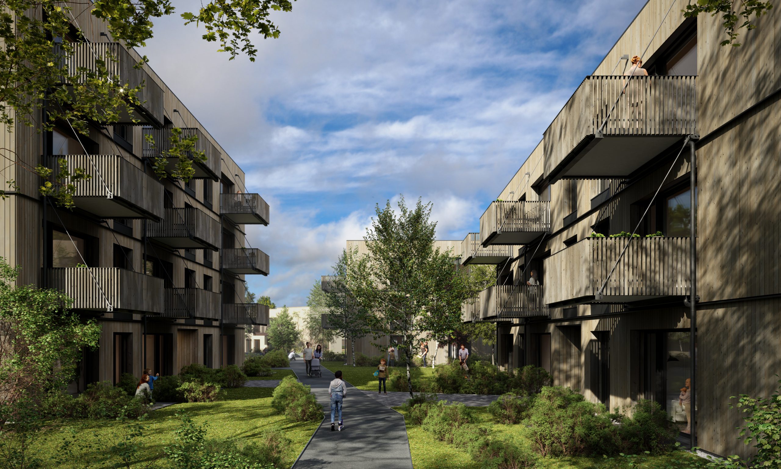 Quartiersneubau mit drei- bzw. viergeschossigen Wohn- sowie Wohn- und Geschäftsgebäuden in Massiv-, Holzhybrid und Holzbauweise; gebäudeübergreifende Tiefgaragen.